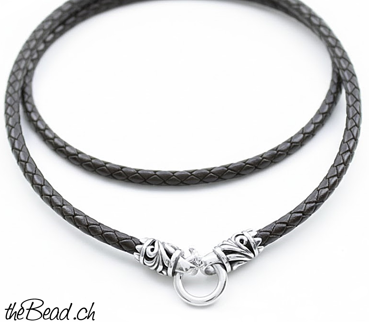 Ob lässig zum T-Shirt oder elegant zum Hemd – diese Lederkette mit Silberverschluss und Verschlussring ist das perfekte Accessoire für den modernen Mann, der Wert auf Individualität legt.