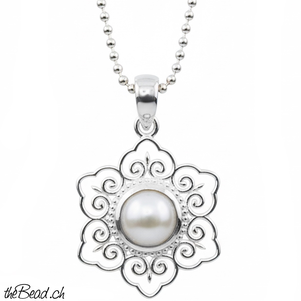 Sehr schönes Silberschmuckstück bestehend aus einer Silberkette und einem filigranen Anhänger in dessen Mitte eine echte Perle eingefasst ist. Der Silberanhänger ist hübsch gearbeitet und erinnert an eine Blume mit Blütenplättern.
