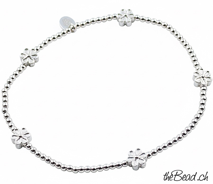 Bei diesem Armband wechseln sich kleine Kügelchen und Silberblümchen ab, die Silberelemente sind auf ein elastisches Band aufgezogen.