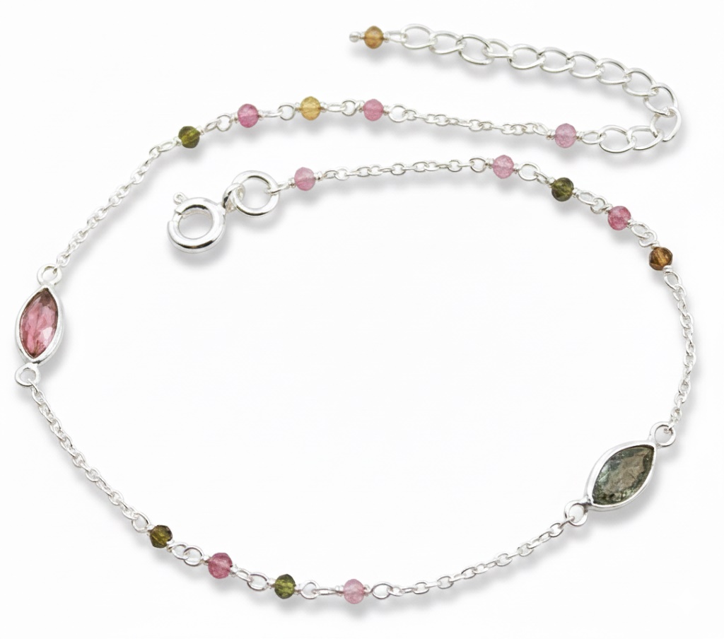 Verleihen Sie Ihrem Look eine elegante und verspielte Note mit unserem zauberhaften Silber-Fusskettchen. Dieses filigrane Kettchen aus hochwertigem Silber ist besetzt mit kleinen, bunten Turmalin-Edelsteinchen, die bei jeder Bewegung ein dezentes Funkeln erzeugen, dazu runden zwei in Silber eingefasste Turmline den Look ab.