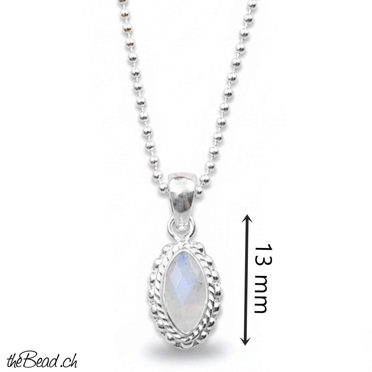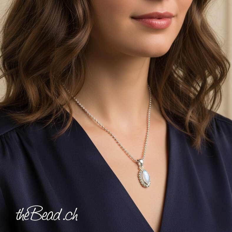 Silberhalskette mit Regenbogenmondstein Anhänger, der Regenbogenmondstein ist wunderschön in Silber eingefasst, die Einfassung ist im Pünktchenmuster verziert, perfekt passend zur zarten Silber Kugelkette.