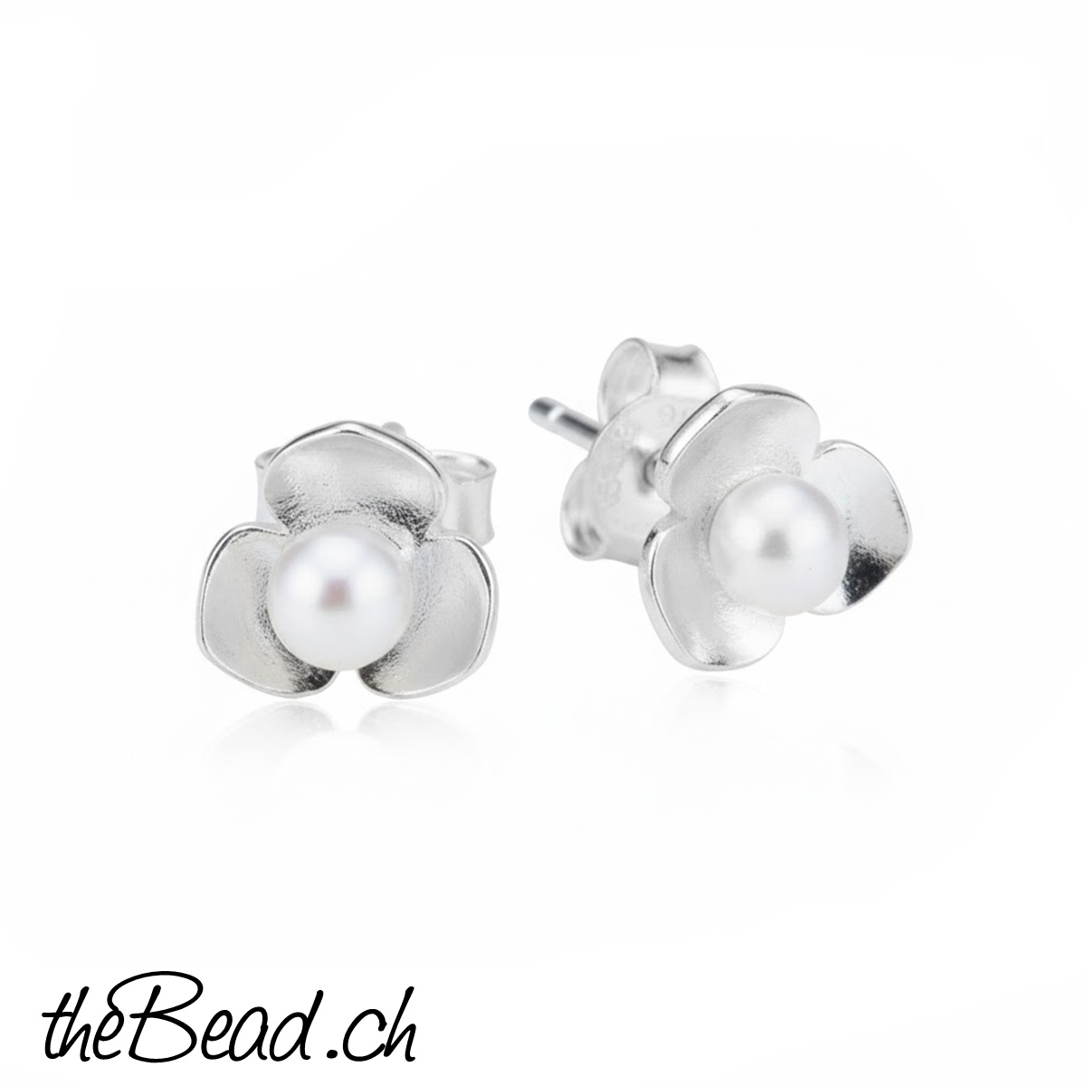 Die Ohrringe sind wie eine kleine Blüte gestaltet die in der Mitte mit einer echten Perle verziert ist