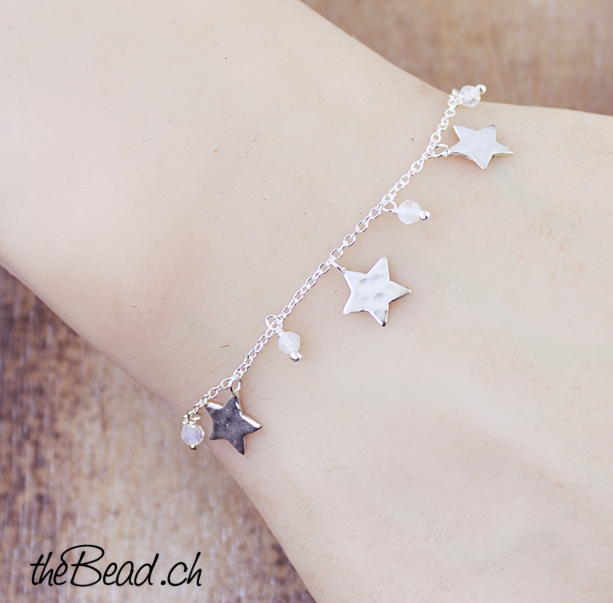 Silberarmband mit Sternen & Regenbogenmondstein Anhängern