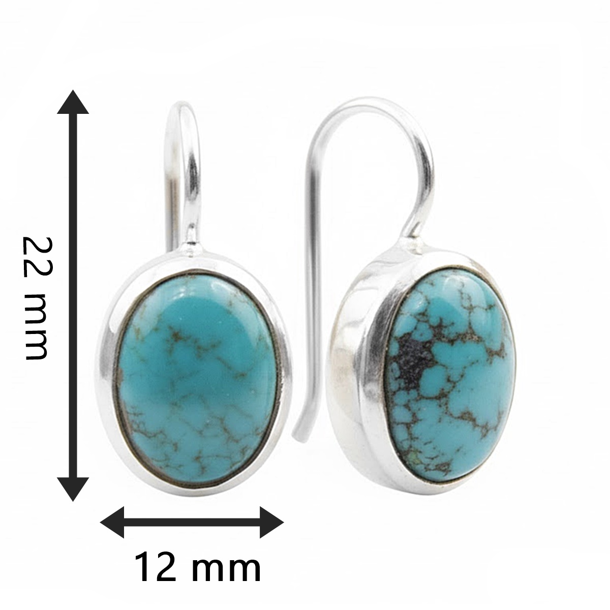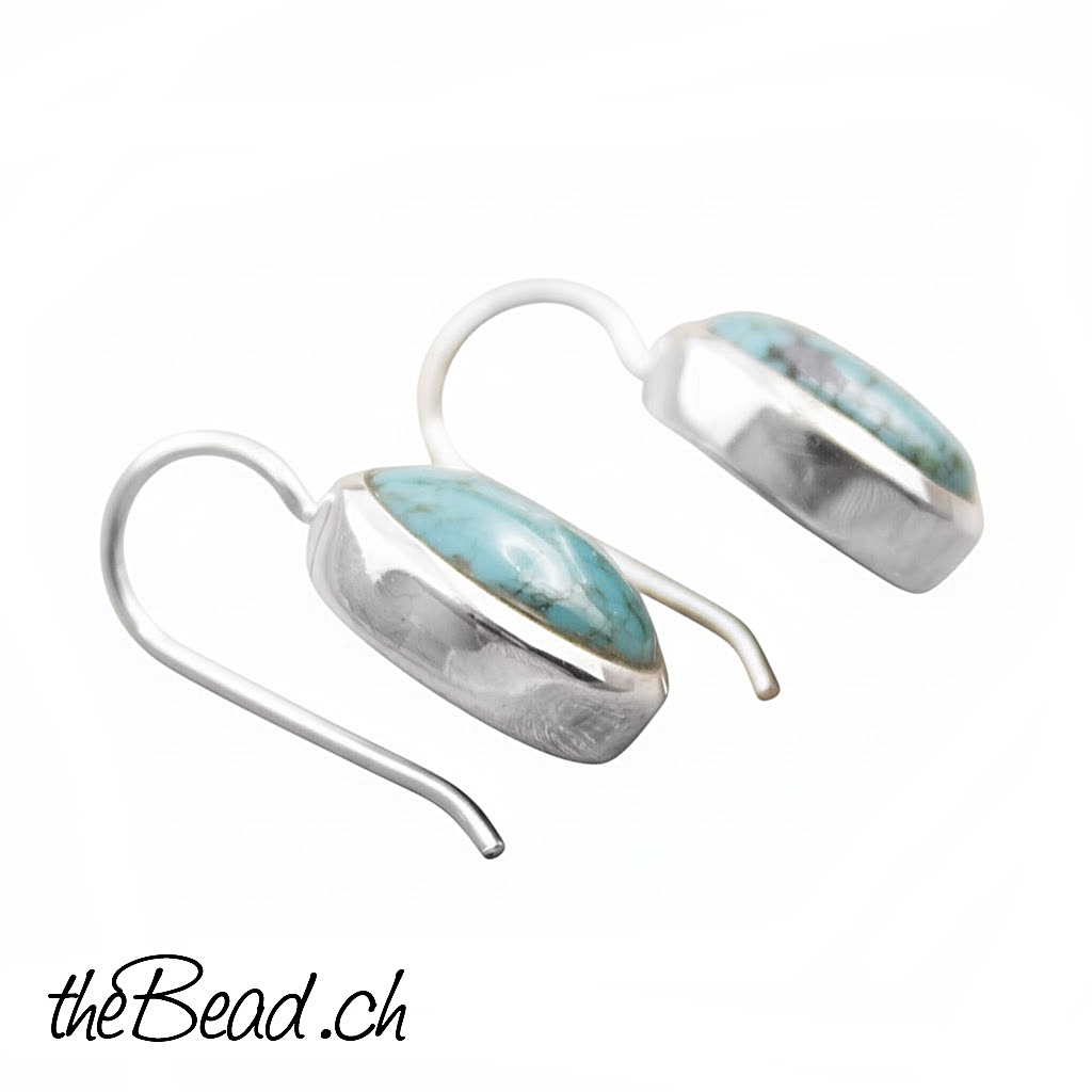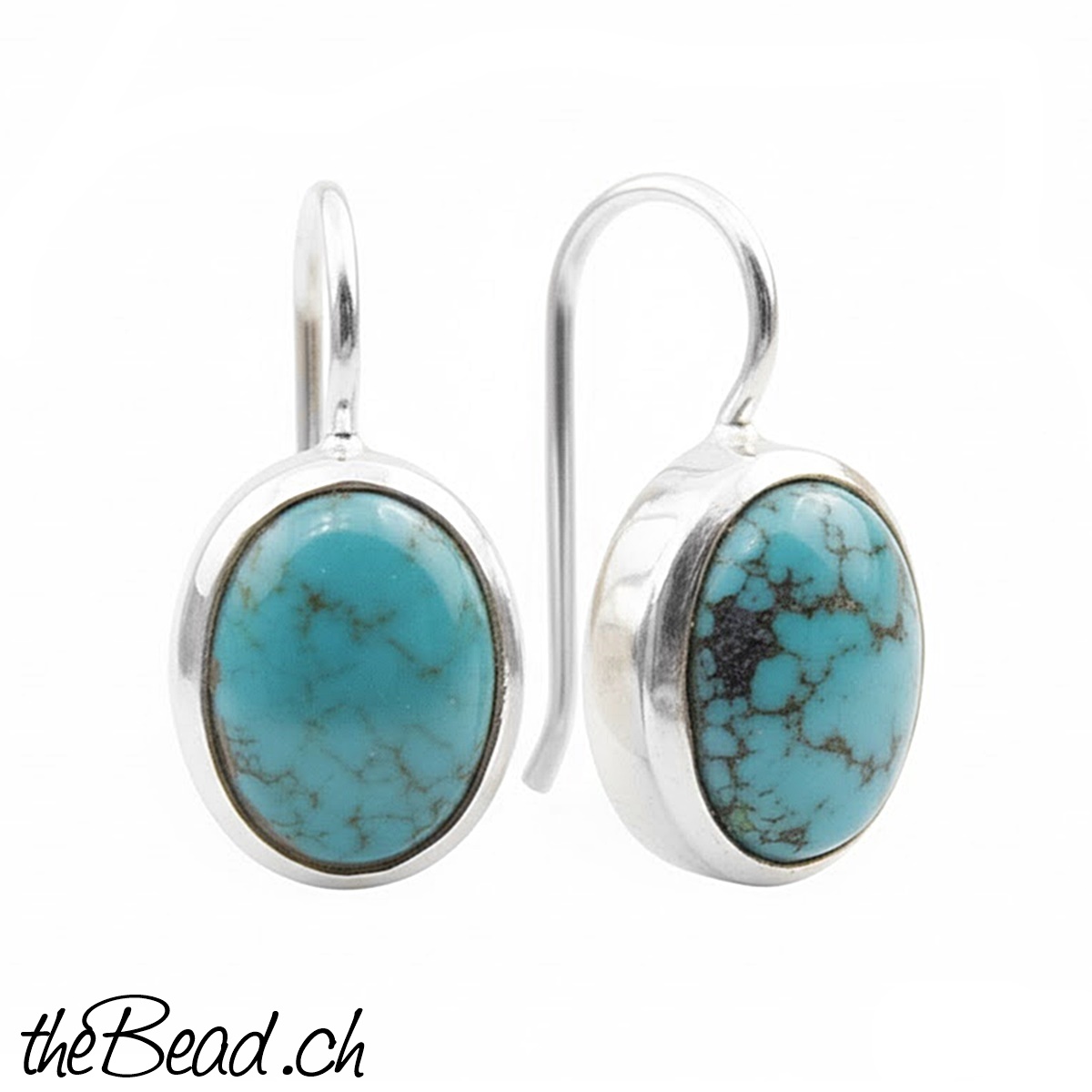 Hochwertige Silberohrringe mit ovalen Türkisen. Jeder Türkis hat ein einzigartiges Muster, aus diesem Grund erhalten Sie genau die abgebildeten Ohrringe. So wissen Sie genau wie die Ohrringe aussehen.