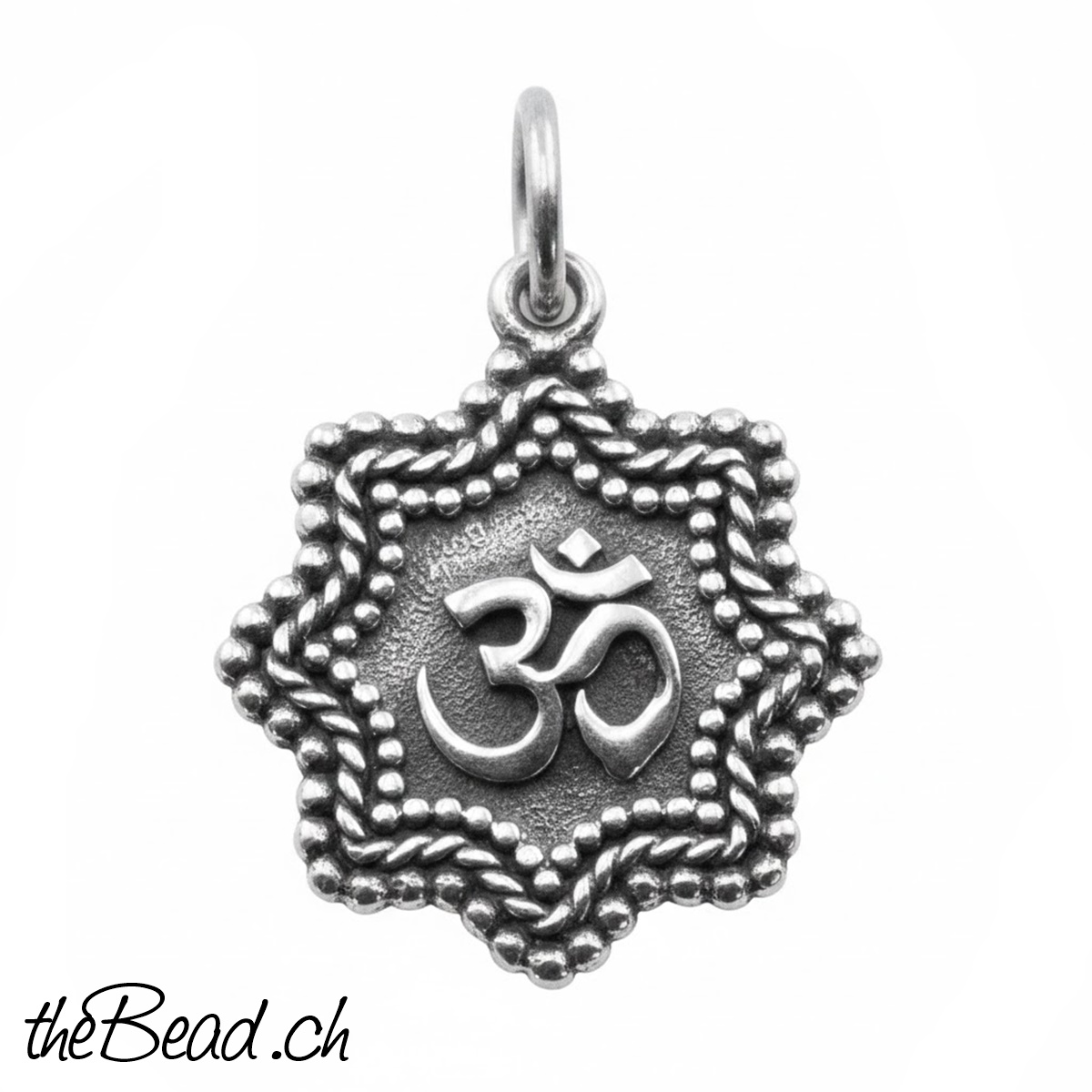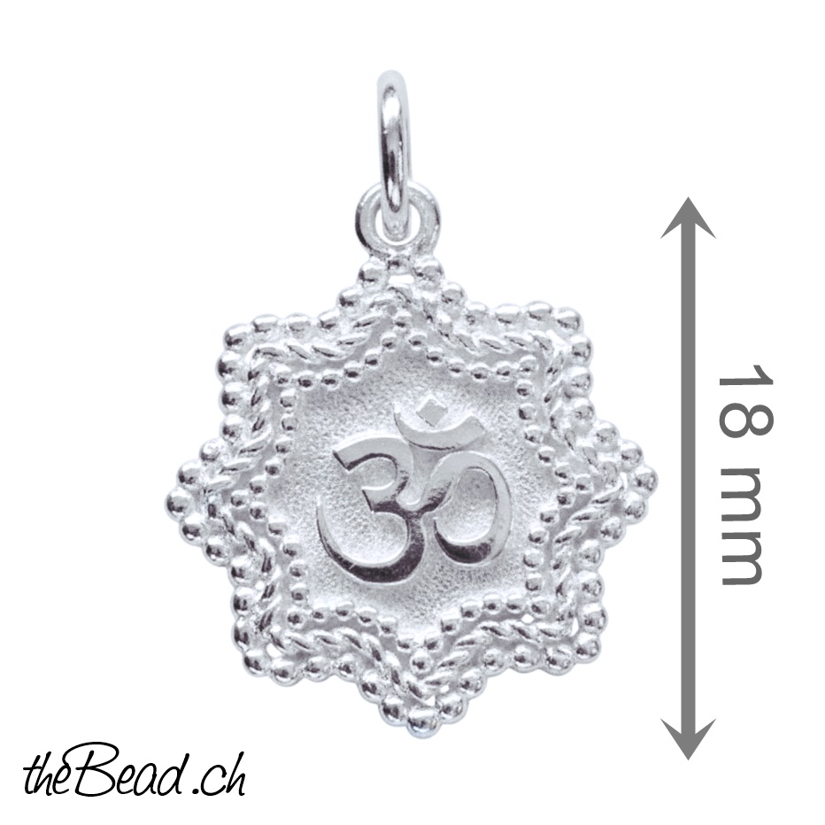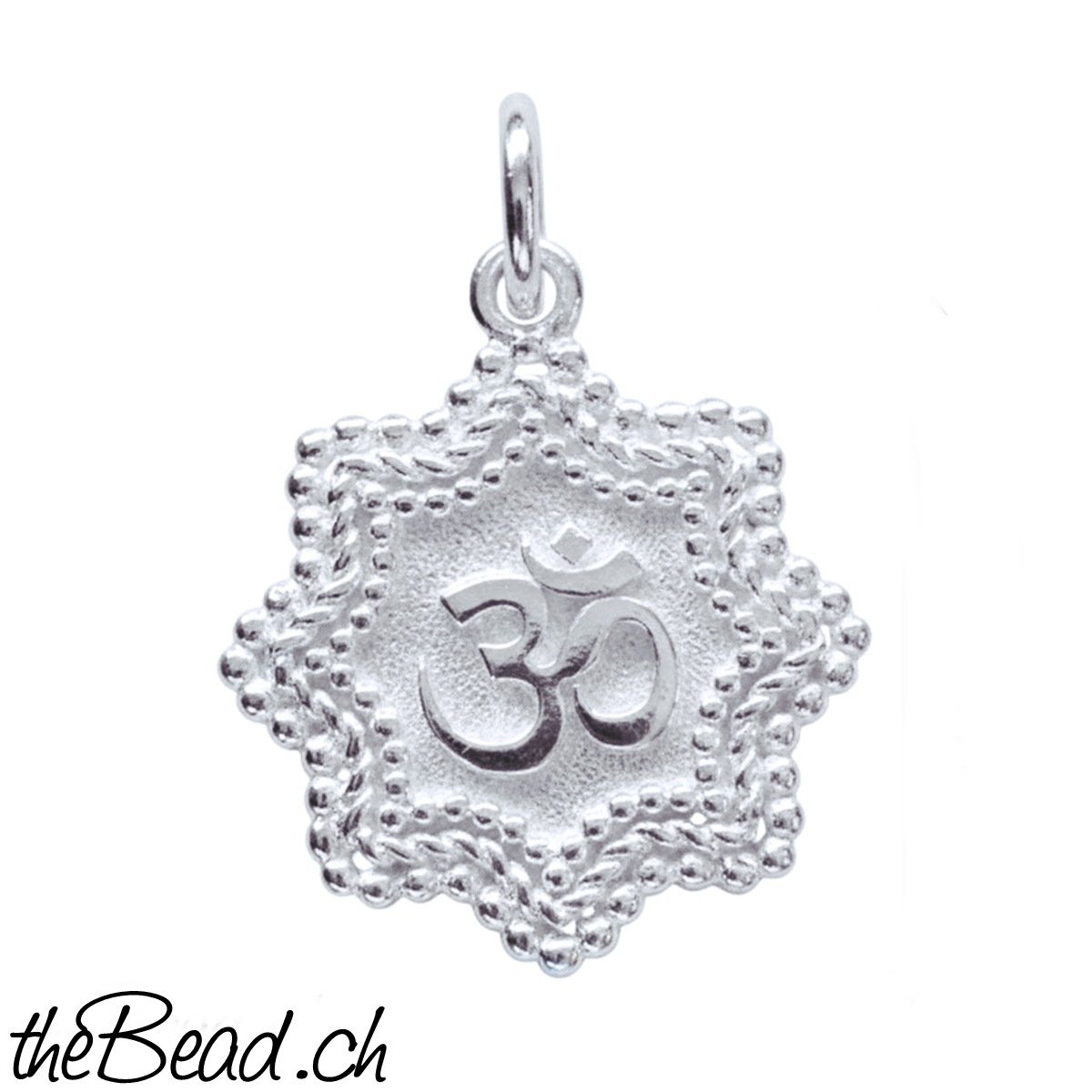 Der Anhänger ist aus Silber gefertigt und zeigt ein OM Zeichen, das Symbol steht für Einheit, kosmisches Bewusstsein und die ewige Realität.
