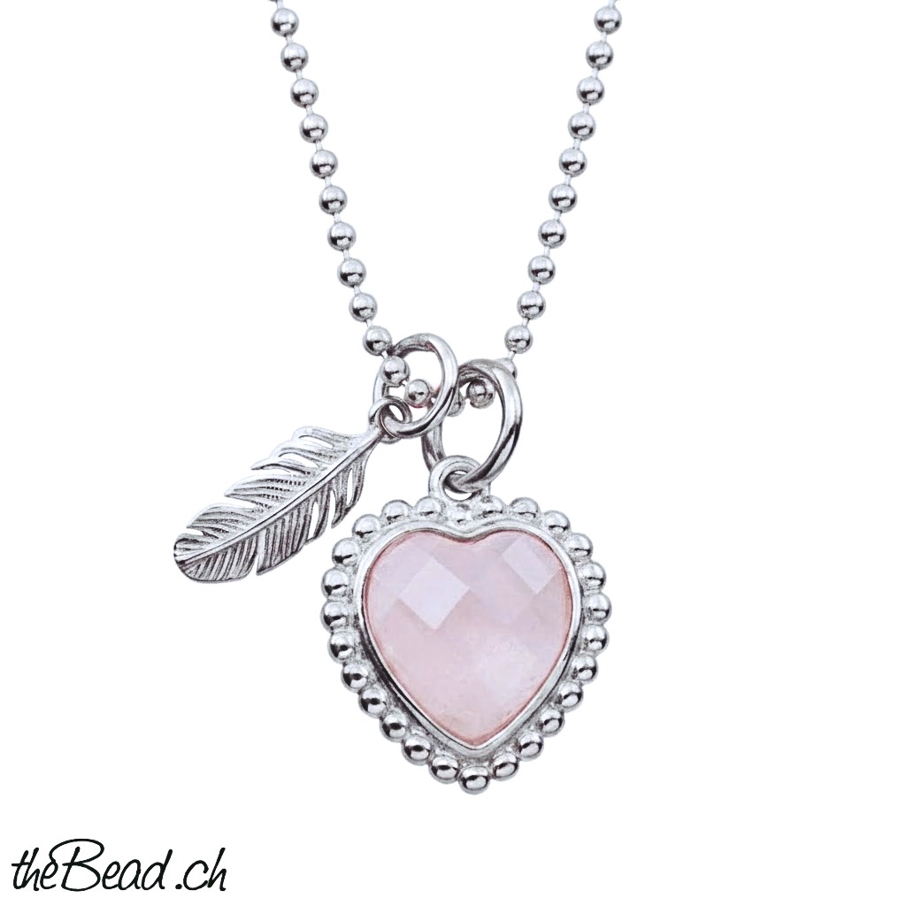 Rosenquarz Herz & Feder Anhänger mit Silberkette