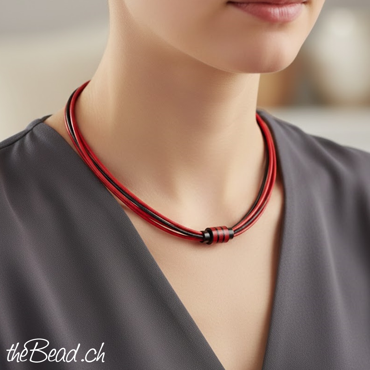 Die Halskette besteht aus Lederbändern in verschiedenen Farben und wird mit einem praktischem Magnetverschluss geöffnet/geschlossen. Die Länge der Lederkette ist in 40, 42, 45 oder 50 cm wählar.