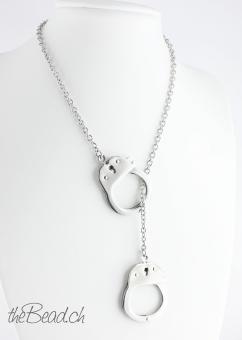 Die Handschellen sind je ca. 3.5 x 2.5 cm gross und lassen sich wie die " Echten " öffnen und schliessen, die Kettenlänge können Sie zwischen 40,50,60 und 70 cm wählen ( wenn Sie keine Auswahl treffen erhalten Sie automatisch die 50 cm lange Kette )
